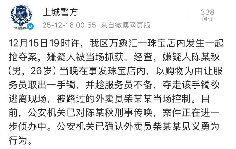 12月16日凌晨,杭州“上城警方”微博发布通报:12月15日19时许,上城区万象汇一珠宝店内发生一起抢夺案,嫌疑人被当场抓获。经查,嫌疑人陈某秋(男,26岁)当晚在事发珠宝店内,以购物为由让服务员取出一手镯,并趁服务员不备,夺走该手镯欲逃离现场,被路过的外卖员柴某某当场控制。目前,公安机关已对陈某秋刑事传唤,案件正在进一步侦办中。公安机关已确认外卖员柴某某见义勇为行为。
